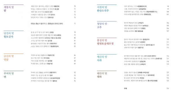 이 책자에는 여행객은 물론 도민들에게도 잘 알져지지 않은 충남의 색다른 맛을 경험할 수 있도록, 식품의약품안전처 인증을 받은 83개 업소의 모든 정보를 수록했다.