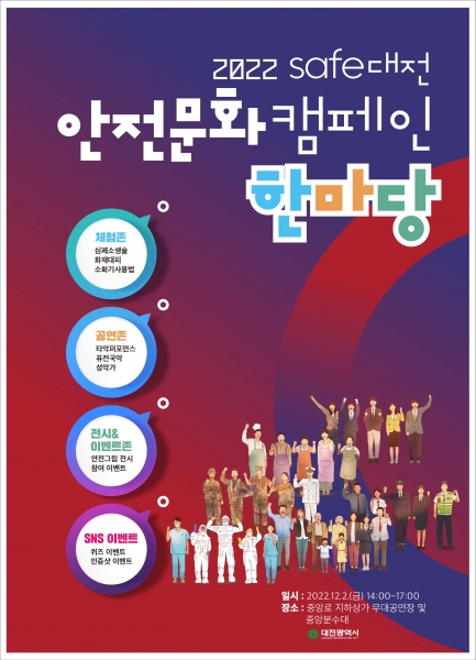 [Ytv영상스토리] 대전시가 오는 12월 2일 오후 2시에서 5시까지 중앙로지하상가 무대공연장 및 중앙분수대에서‘세이프대전 안전문화 캠페인 한마당’행사를 개최한다고 밝혔다.