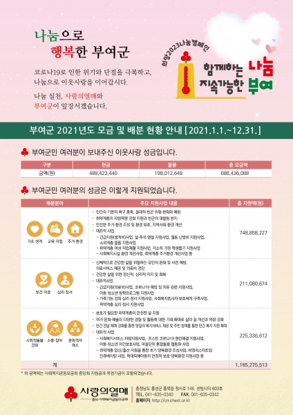 박정현 군수는 “여전히 어려운 시기지만 우리 주변 어려운 이웃과의 행복한 동행을 위해 부여군민 모두가 한마음으로 동참해 주길 부탁드린다”고 당부했다.