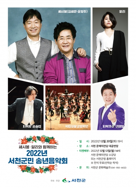 [Ytv영상스토리] 서천군이 오는 20일 19시 서천 문예의전당 대공연장에서 ‘쎄시봉과 알리가 함께하는 2022년 서천군민 송년음악회’가 열린다고 1일 밝혔다.