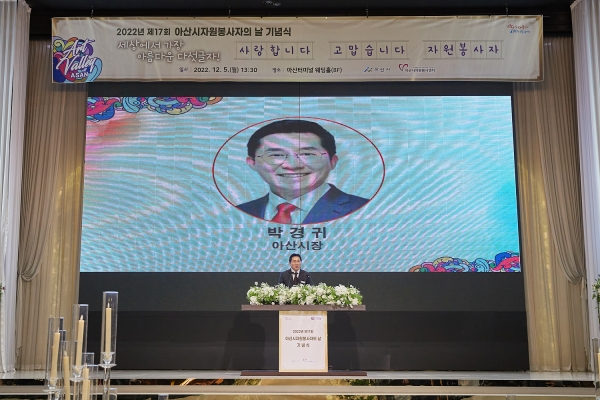 기념식에 참석한 박경귀 시장은 “올 한해 지역사회 곳곳에서 묵묵히 활동하신 자원봉사자 여러분께 다시 한번 감사드린다 ‘사랑한다 고맙습니다 자원봉사자’를 여러 번 외쳐도 부족함이 없다”며 “특히 지난 8월 청양과 부여의 수해 복구를 위한 자원봉사자 120여명의 온정의 손길은 아산시의 이름을 드높였다”고 치하했다.