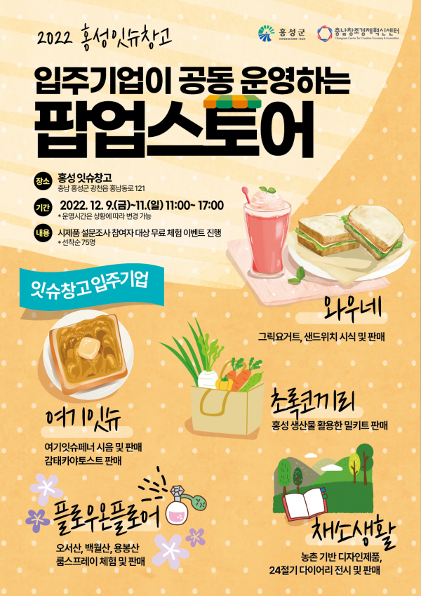 행사장에는 감태 카야토스트 판매, 여기잇슈페너 시음 및 판매 오서산, 백월산, 용봉산 룸스프레이 체험 및 판매 그릭요거트, 샌드위치 시식 및 판매 홍성 생산물을 활용한 밀키트 판매 농촌기반 디자인제품, 24절기 다이어리 전시 및 판매할 계획이며 시제품 설문조사 참여자 대상으로 선착순 무료 체험 이벤트도 함께 진행한다.