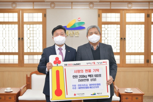 군 관계자는 “지역사회 소외되고 어려운 이웃을 위해 따뜻한 나눔의 정을 몸소 실천한 대한한돈협회 예산군지부에 진심으로 감사드린다”며 “군민 모두가 온정을 함께 나누고 국산 돼지고기 소비가 늘어나 양돈농가에도 큰 도움이 되길 바란다”고 밝혔다.