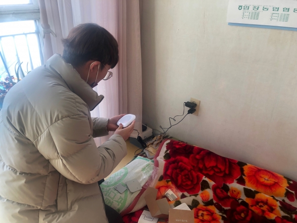 천안시복지재단의 지원을 받아 준비한 초인등은 호출벨을 누르면 수신기 모니터에 설치된 LED등이 밝아지는 장치로 청력 저하된 어르신들이 외부의 호출을 감지할 수 있다.
