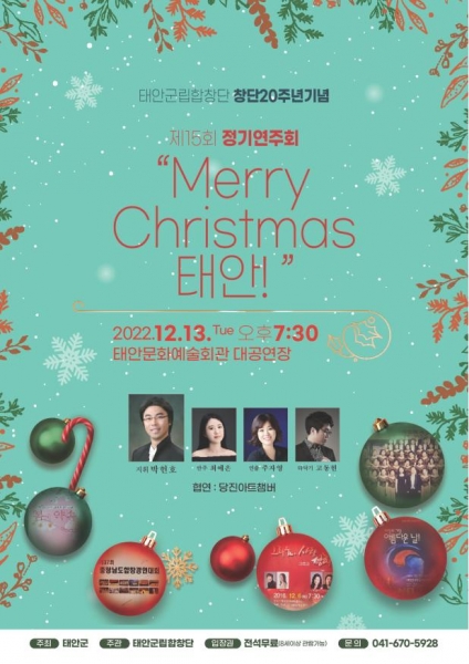군은 오는 13일 오후 7시 30분 태안문화예술회관 대공연장에서 ‘메리크리스마스 태안’을 주제로 태안군립합창단 창단 20주년 기념 제15회 정기연주회를 개최한다고 밝혔다.