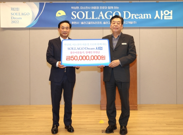 군에 따르면, 솔라고는 지난 9일 솔라고리조트 대연회장에서 가세로 군수를 비롯해 박경재 회장과 ‘솔라고 골프앤리조트’ 박상현 대표이사, ‘솔라고 컨트리클럽’ 유남종 대표이사 및 허윤경 이사 등이 참석한 가운데 ‘제2회 솔라고 드림 사업 후원금 전달식’을 갖고 1억원을 태안군에 전달했다.