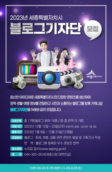 최종 선정된 블로그 기자단은 세종시 정책, 문화, 명소 등 세종시를 주제로 한 홍보 콘텐츠를 취재·제작하며 기사 채택 시 소정의 원고료가 지급된다.
