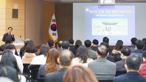 시는 12일 대회의실에서 이원승 예비역 육군 준장을 초청해 이완섭 시장을 비롯한 공직자 1백여명을 대상으로‘해미읍성 역사인물 선양 및 관광자원화 방안’특강을 열었다.