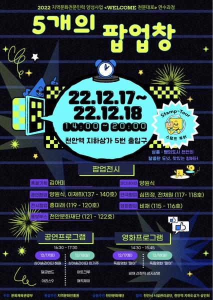 팝업스토어는 공연·연극·영화·전시·천안문화재단 사업소개 등 5개의 부스별로 다양한 천안의 문화정보를 제공한다.