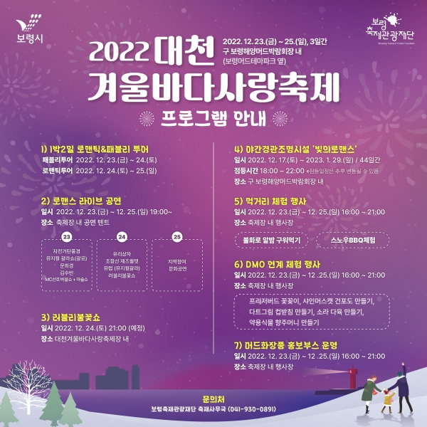 재단법인 보령축제관광재단이 주관하는 대천 겨울바다 사랑축제는 낭만적인 대천해수욕장을 배경으로 러블리 불꽃쇼, 로맨틱&패블리 투어, 로맨스 라이브 공연, 스노우 BBQ체험 등 17개 프로그램을 진행한다.