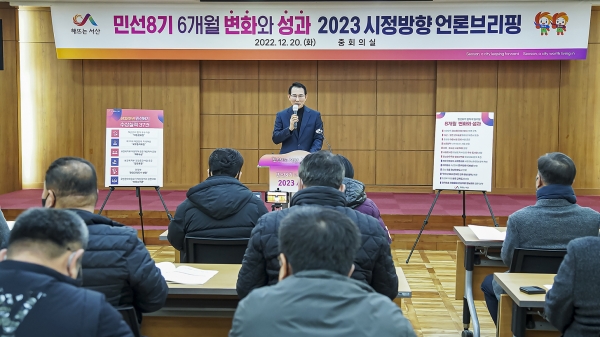 [Ytv영상스토리] “승풍파랑의 기세로 내년도 가시적인 성과를 이어 나가겠다” 이완섭 서산시장이 20일 시청 중회의실에서 ‘민선8기 6개월 변화와 성과 및 2023년 시정방향’ 관련 브리핑을 열고 이같이 말했다.
