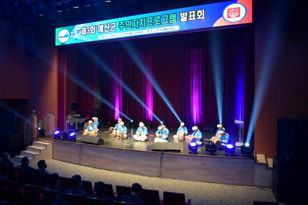 발표회는 봉산면 주민자치 프로그램 사물놀이 공연을 시작으로 신암면 노래교실 신양면 노인건강체조 광시면 사물놀이 오가면 장구난타 예산읍 기타 고덕면 풍물 삽교읍 노래교실 덕산면 댄스스포츠 응봉면 난타 대술면 노래&기타 대흥면 판굿 등 순으로 진행됐으며 주민자치위원과 주민들의 적극적인 참여로 성황리에 진행됐다.