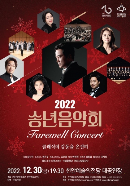 천안예술의전당의 올해 마지막 공연인 이번 송년음악회는 지휘자 함신익, 심포니 송 오케스트라의 연주, 세계적인 소프라노 양민경, 메조 소프라노 김선정, 테너 이명현, 바리톤 김동섭, 첼리스트 이시화, 국립합창단과 천안시립합창단이 출연해 특별한 무대를 선보인다.
