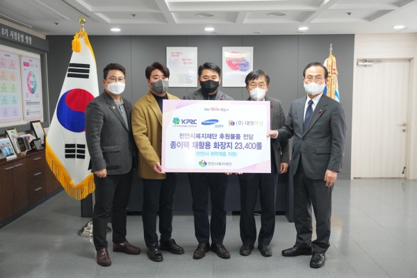 이번 후원물품은 자원순환 사회 구축 및 사회공헌 활동 실천을 위해 환경부, 천안시, 한국포장재공제조합, 삼성전자, 대성자원 간 종이팩 분리배출·회수 업무협약을 기반으로 마련됐다.