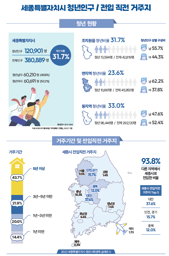 세종에 거주하는 청년의 93.8%가 다른 지역에서 ‘세종’으로 전입한 경우로 전입 전 거주지는 ‘대전’ 37.6%, ‘수도권’ 25.2% 순이었다.
