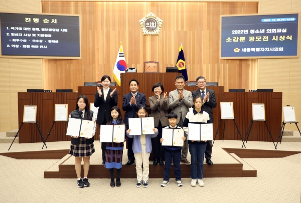 [Ytv영상스토리] 세종특별자치시의회는 28일 본회의장에서 ‘2022년 청소년 의회교실 소감문 공모전’ 시상식을 개최하고 우수작으로 뽑힌 7명에게 상장을 수여했다.