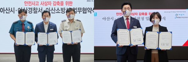 시는 지난 7월 안전사고 사상자 감축을 위한 기본계획 수립 후 안전 문화운동 추진협의회와 실무협의회 구성 안전사고 사상자 감축을 위한 유형별 TF 구성 신종감염병 대응을 위한 보건·의료 협의체 구성 제4차 교통안전기본계획 수립 아산경찰서·아산소방서·아산교육지원청과 협약체결 추진 등 적극적인 안전관리 체계 구축에 나섰다.