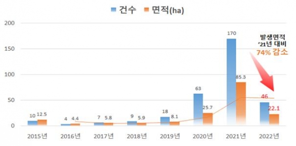 도 농업기술원에 따르면 올해 공적방제 대상 46농가 22.1ha에 대한 손실보상금 지급액은 33억원으로 전년 170농가 85.3ha 133억원 대비 100억원을 절감했다.