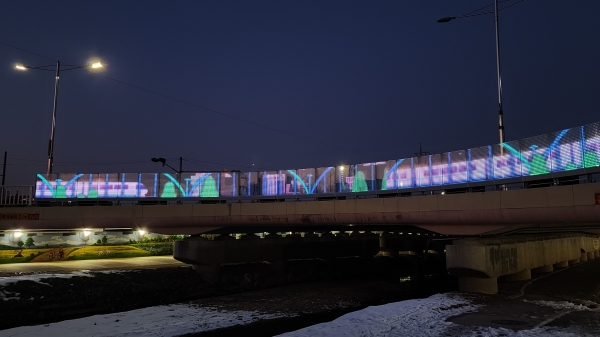 기존 낡았던 천안 서부역사교 난간 보수작업의 일원으로 준공된 미디어글라스는 스마트 디스플레이 소재를 활용해 다양한 이미지와 문구를 송출할 수 있다.