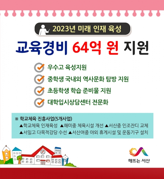 [Ytv영상스토리] 충남 서산시는 2023년 미래 인재 육성을 위해 관내 초·중·고·특수학교 54개교에 27개 사업 총 64억원의 교육경비를 지원한다고 5일 밝혔다.