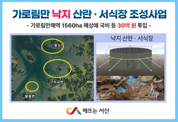 이완섭 서산시장은 “낙지는 서산9품 중 하나로 산란·서식장 조성사업이 가로림만 지역 특화 어종인 낙지 자원의 회복과 어업 생산성 증대 및 어촌 경제 활성화에 기여하길 기대한다”고 말했다.